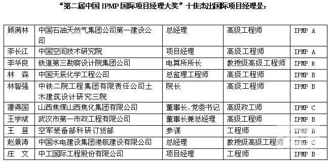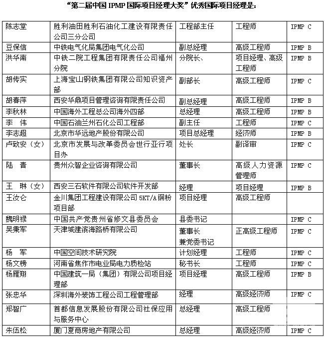 由中国(双法)项目管理研究委员会(PMRC)主办,西安华鼎项目管理咨询有限责任公司(IPMP中国总授权机构)承办,“第二届中国IPMP国际项目经理大奖”组委会负责执行的“第二届中国IPMP国际项目经理大奖”评选活动自2007年6月6号正式启动以来,受到我国广大项目管理界人士和IPMP获证人员的大力支持和积极参与。截止到8月30日为止,本届大奖的报名、评选程序全部结束。根据本届大奖评选活动的议程安排,在8月下旬,第二届中国IPMP国际项目经理大奖评审委员会根据评审要求对参选人员的资格进行了认真、严格地评议,最终从申请参选的项目管理精英中评选出“第二届中国十佳杰出、优秀国际项目经理”30名。现将“第二届中国IPMP国际项目经理大奖”当选人员名单公布如下(按音序排列):