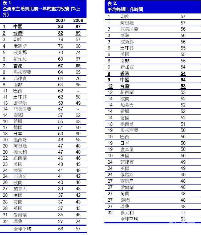 在所有国家及地区中,有三分之二的国家及地区,企业家今年面临的压力要比前年要大。不过,与去年的调查结果相比,比率有所降低。将今年与去年调查中同一项结果进行比较,中国内地企业家面对比往年压力大的比率,比上年下跌三个百分点,香港和台湾则分别下跌二个百分点和七个百分点。